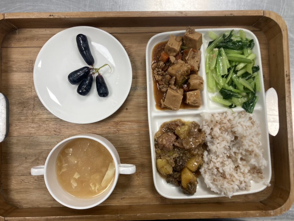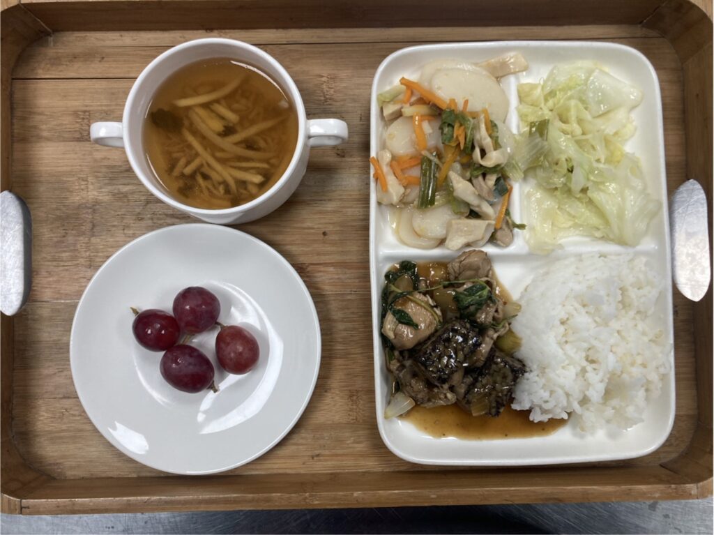 有機糙米飯.三杯雞.家常年糕.有機高麗菜.酸辣湯.葡萄