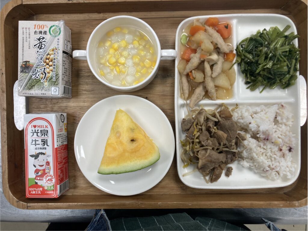 雜糧飯.蒜泥白肉.什錦肉羹.有機空心菜.雞蓉玉米濃湯.西瓜.保久乳豆奶