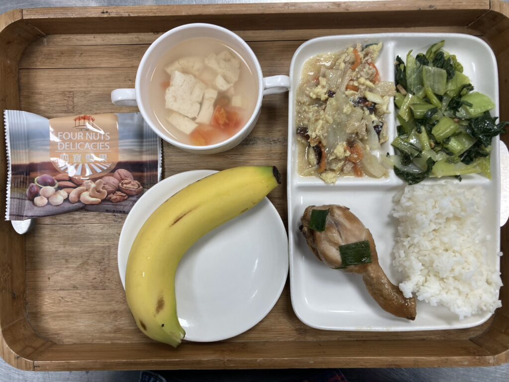 有機白米飯.蠔油雞腿.木須炒蛋.有機味美菜.番茄豆腐湯.香蕉.堅果包