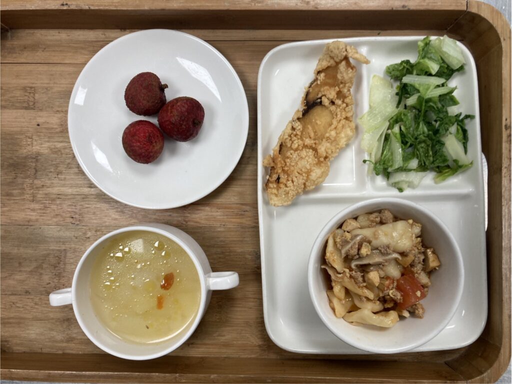 哨子麵疙瘩.椒鹽魚排.有機小白菜.青木瓜大骨湯.荔枝