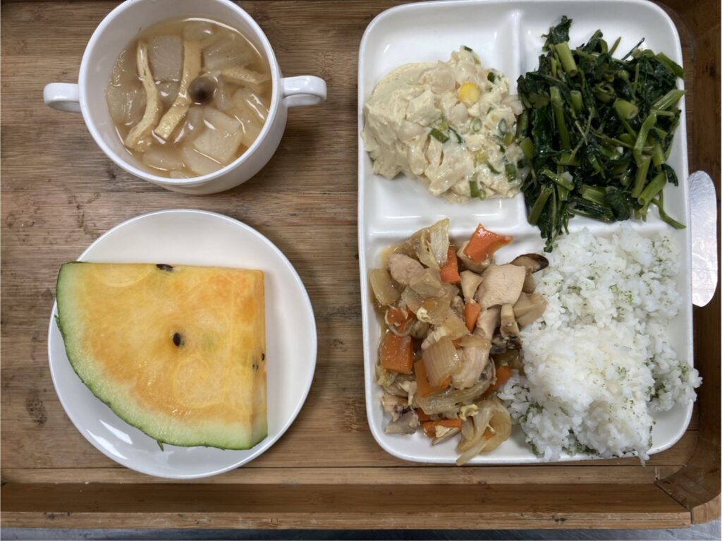 有機米海苔飯.親子雞丼.茶碗蒸.有機空心菜.味噌大根湯.西瓜