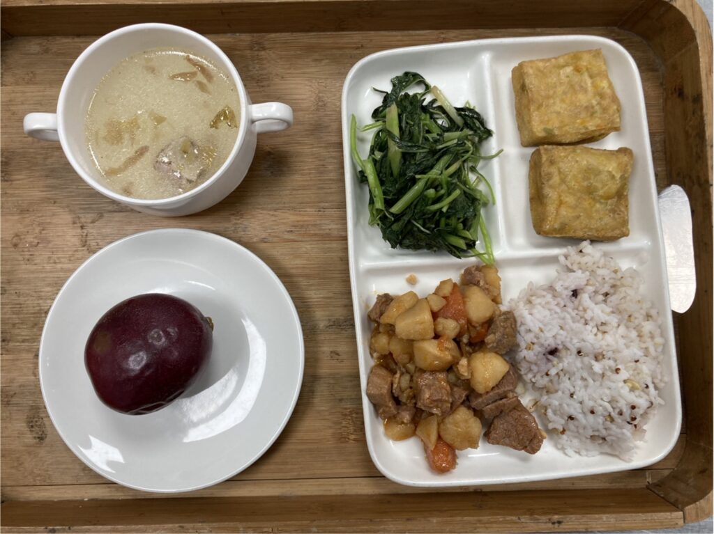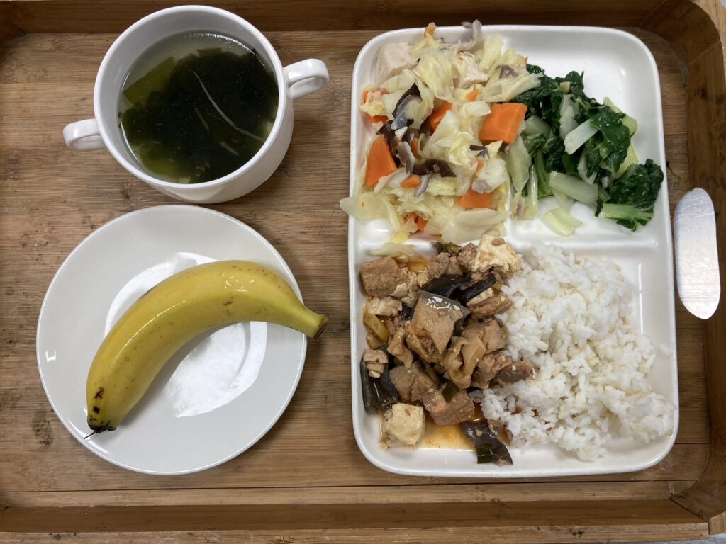 有機糙米飯.麻婆魚丁.高麗菜炒雞丁.有機黑葉白菜.薑絲海芽湯.香蕉