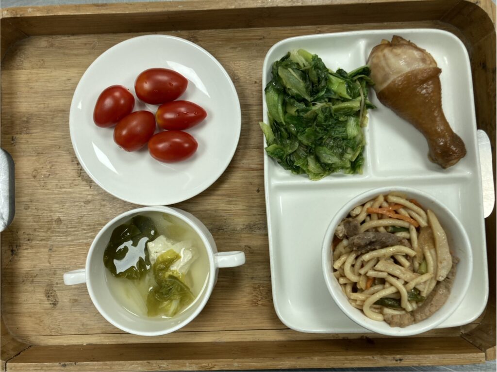 沙茶米苔目.茶香雞腿.薑絲油麥菜.青菜豆腐湯.小番茄