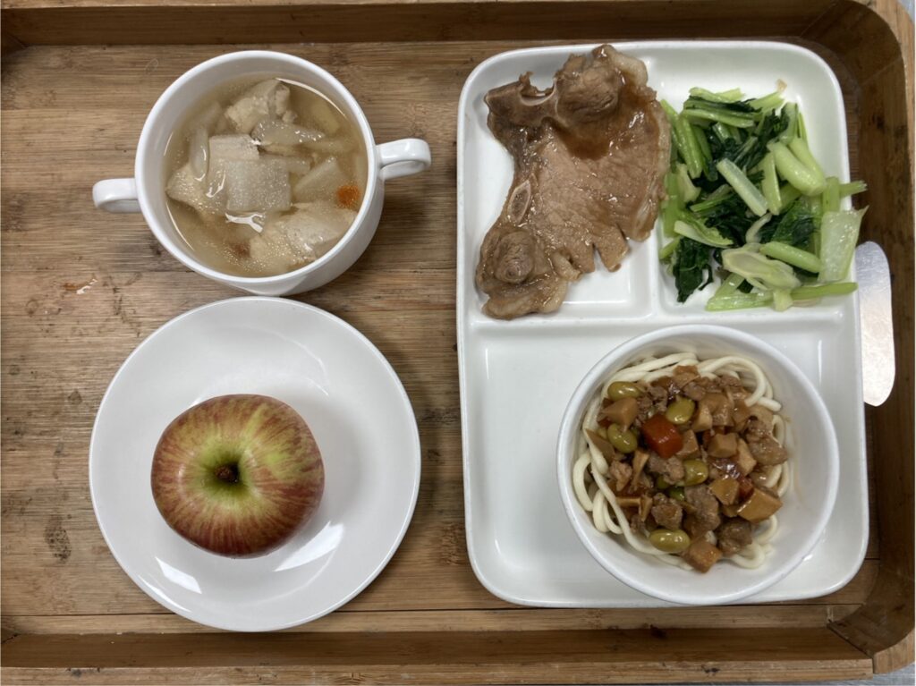 肉燥乾拌麵.滷排骨.蔥酥油菜.藥膳雞湯.蘋果