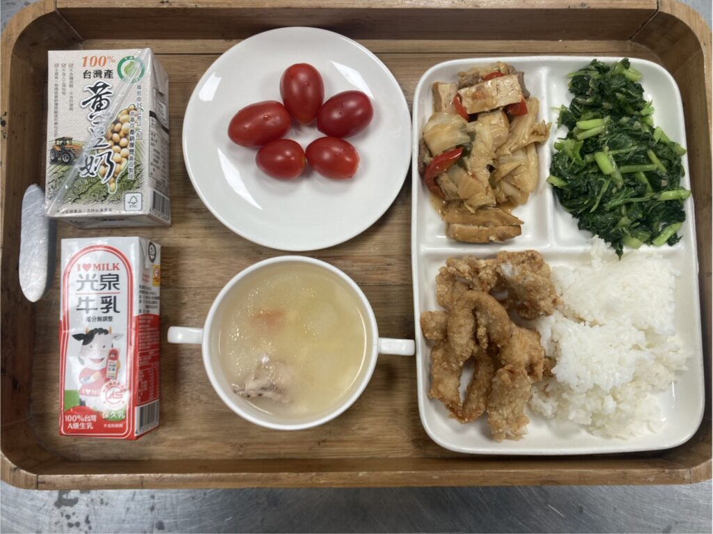 有機白米飯.檸香魚柳.回鍋干片.有機白莧菜.冬瓜雞湯.小番茄.保久乳豆奶
