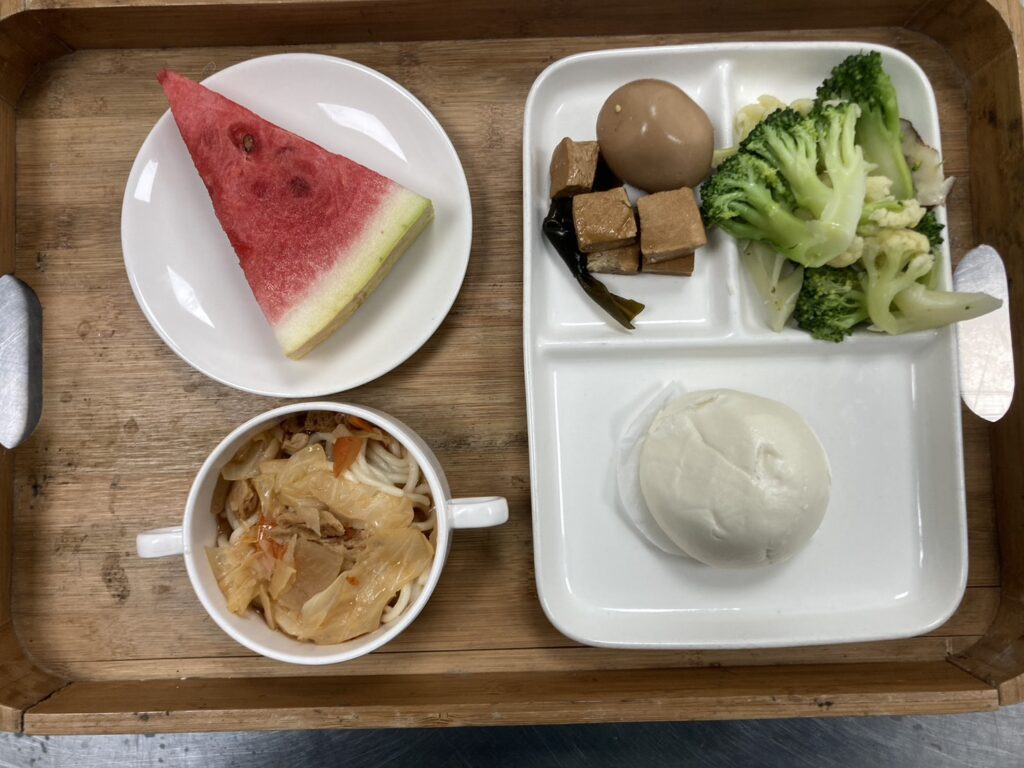番茄紅燒素湯麵.什錦滷蛋.香菇花椰.豆沙包.西瓜
