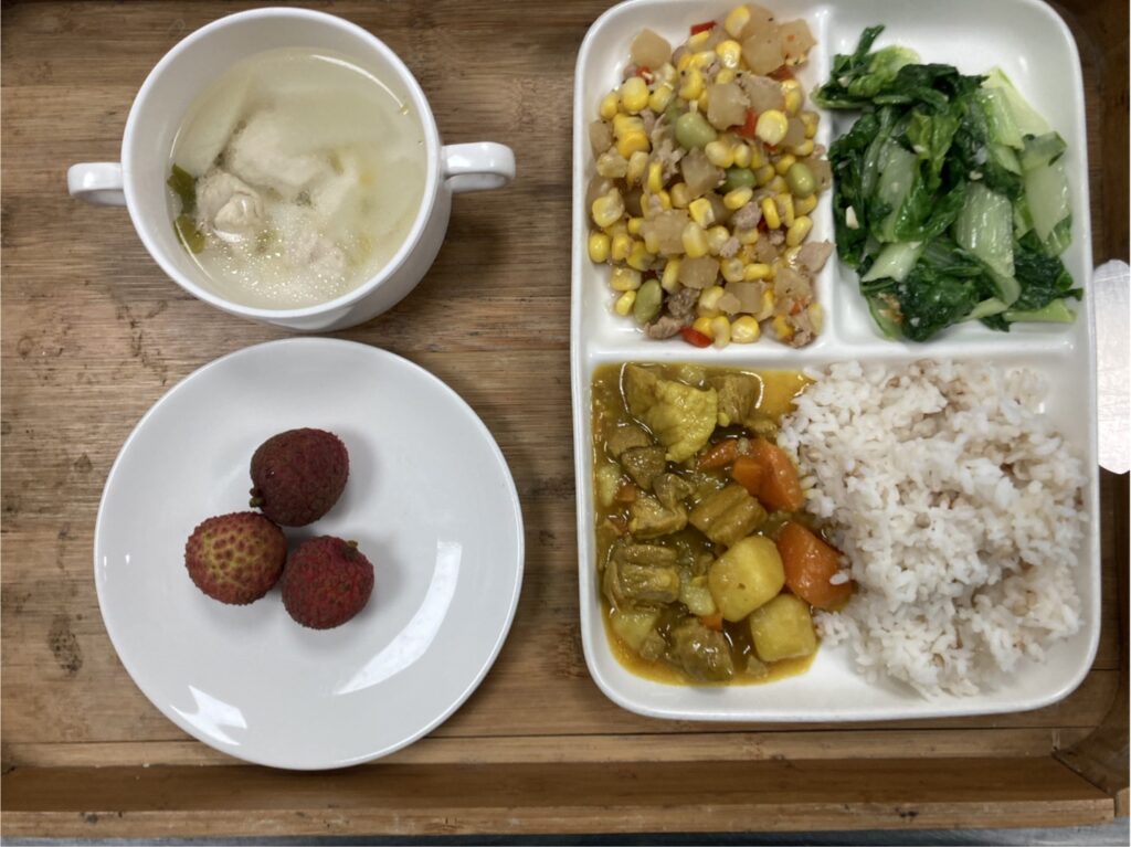 蕎麥飯.咖哩豬.三色玉米.有機荷葉白菜.結菜雞湯.荔枝