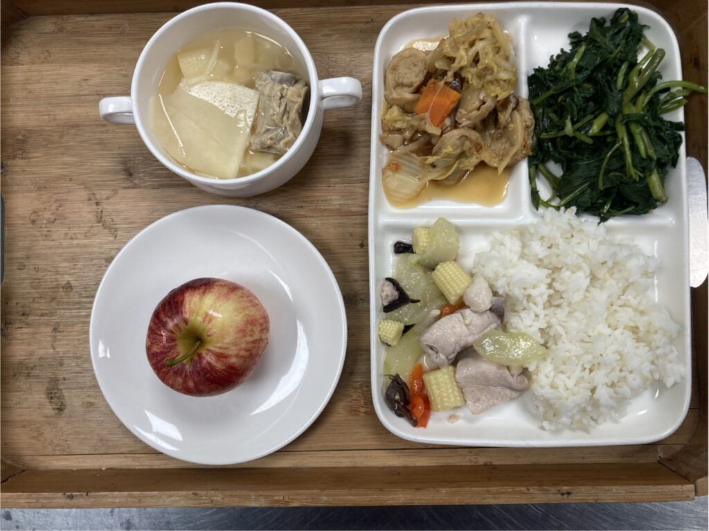 有機糙米飯.黃瓜燒雞.白菜麵腸.蔥酥地瓜葉.筍片龍骨湯.蘋果