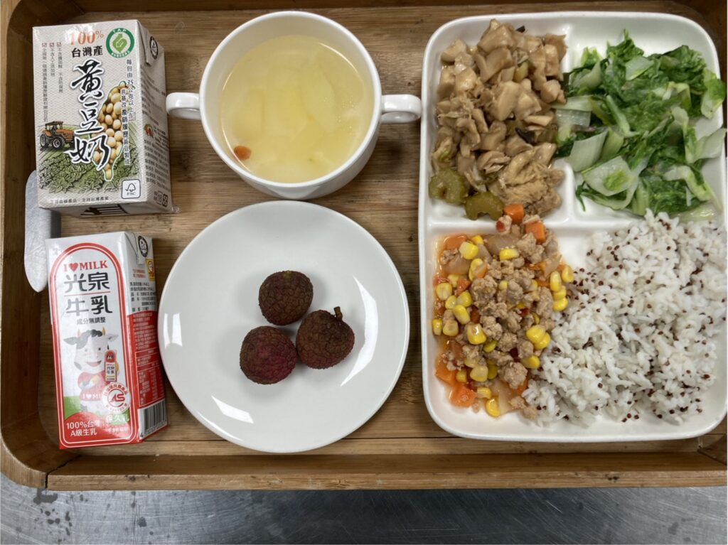 紅藜飯.番茄肉醬.杏鮑菇炒豆包.有機小白菜.青木瓜大骨湯.荔枝.保久乳豆奶