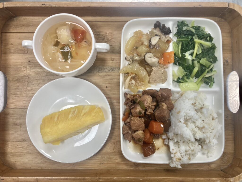 麥片飯.蒲燒鯛.泡菜豆腐.有機高麗菜.年糕肉絲湯.西瓜.保久乳豆奶