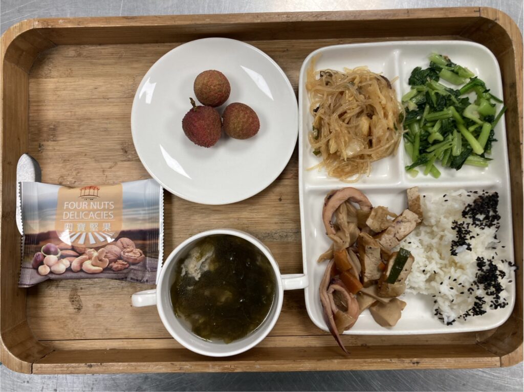 有機米芝麻飯.蔥爆魷魚豆干.螞蟻上樹.有機小松菜.紫菜蛋花湯.荔枝.堅果包